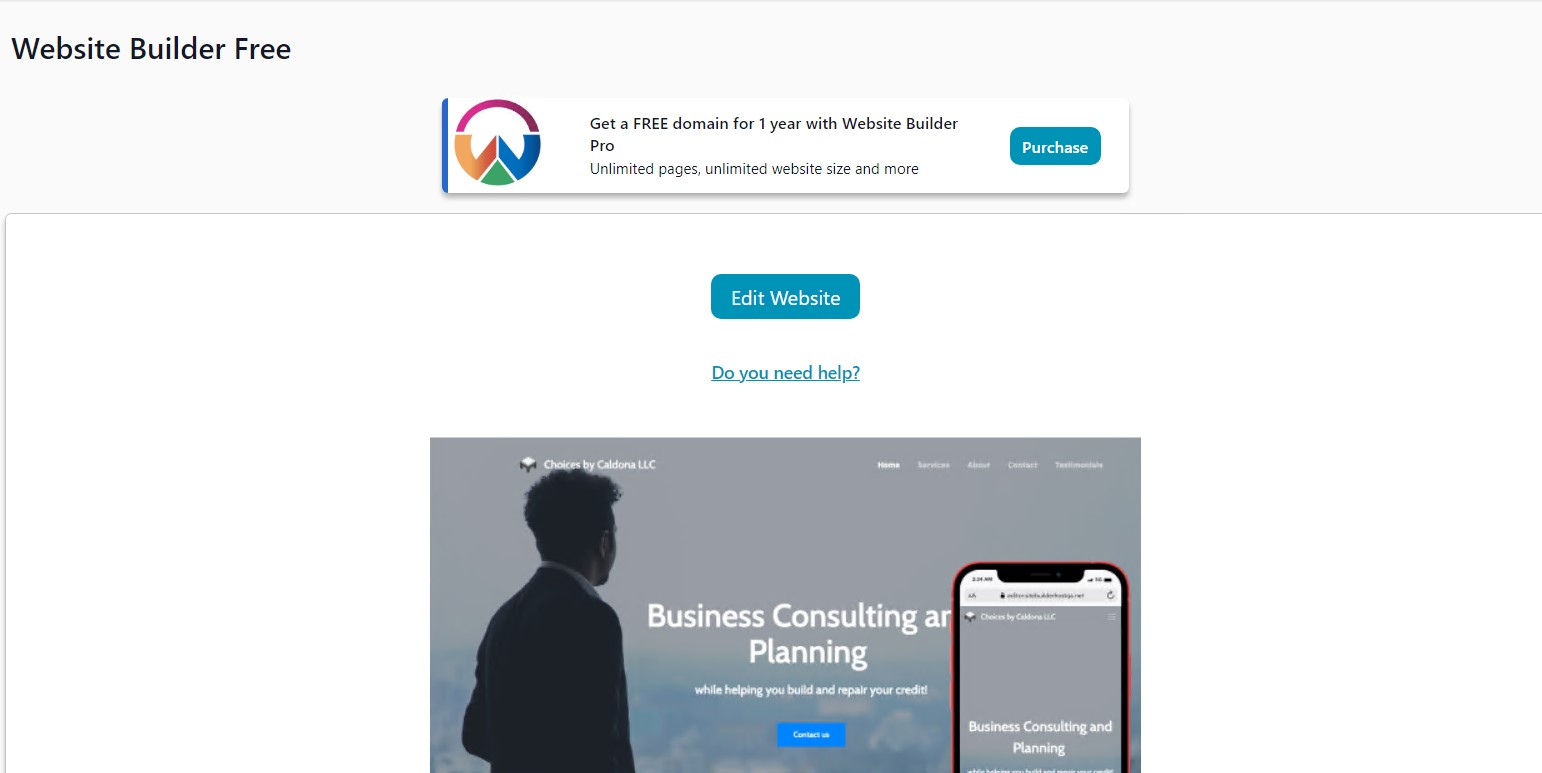 5. Once it completes, the page will refresh and you will be able to use the Website Builder Free product.