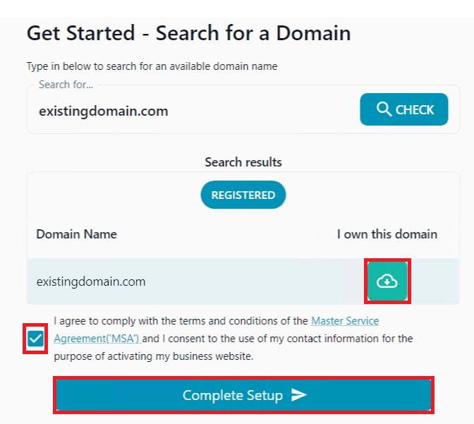 Click on the Complete Setup button to register the domain name and start using it with your